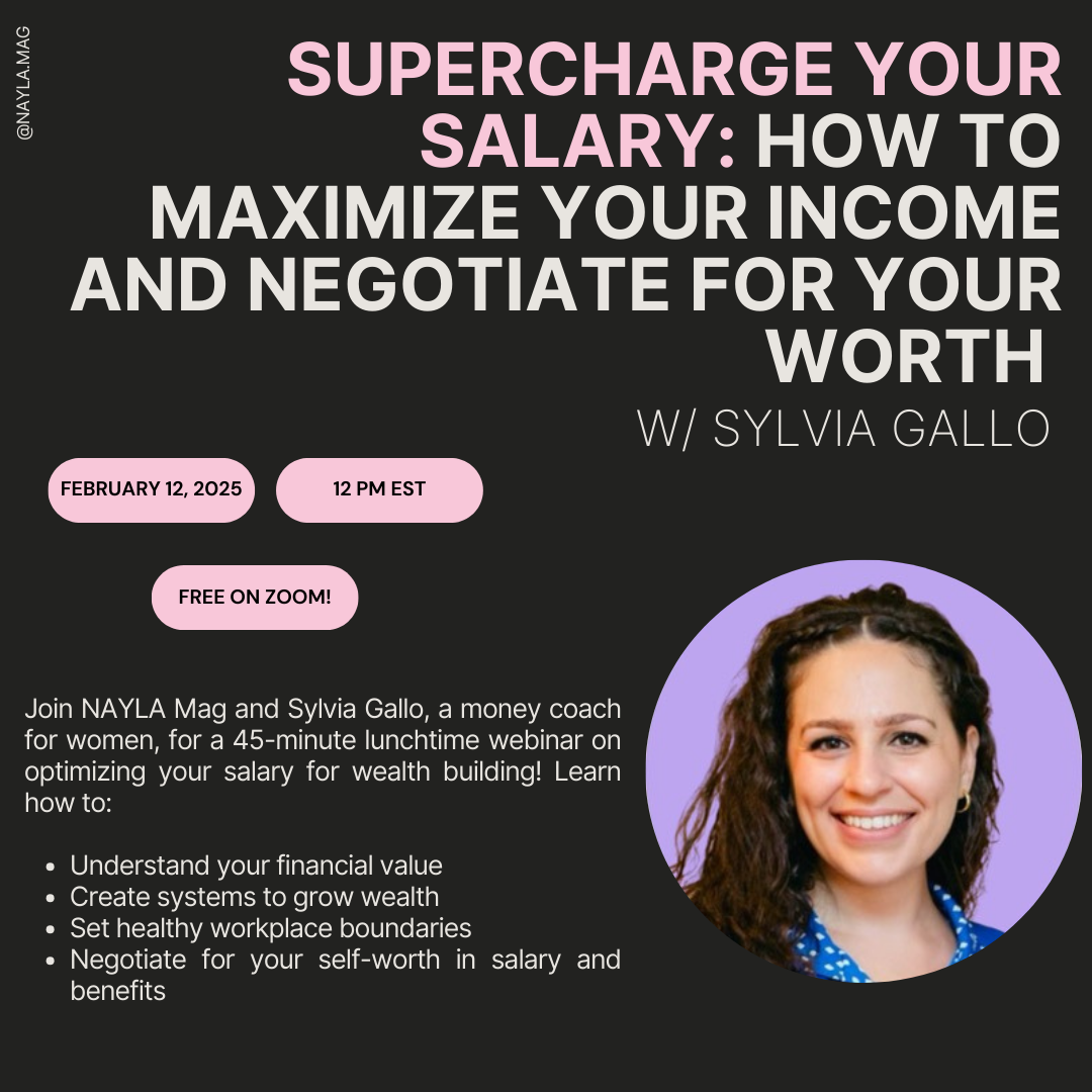 Join NAYLA Mag and Sylvia Gallo, a money coach for women, for a free 45-minute lunchtime webinar on optimizing your salary for wealth building! Learn how to: